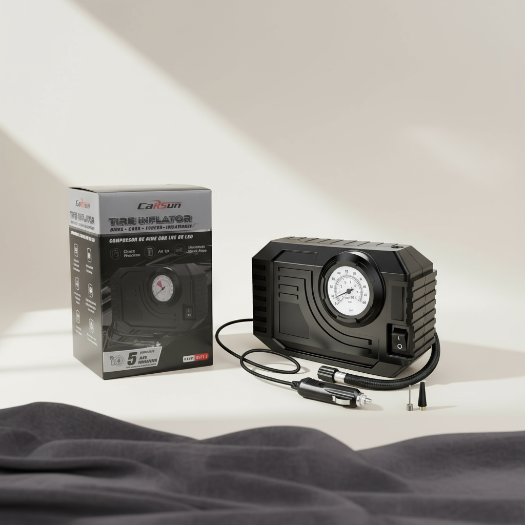 - The tire air compressor works with your 12-volt car accessory outlet and features a built-in dial gauge (0-100 psi), air cooled motor, a bright LED light and 10ft power cord.